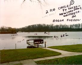 Two single ice circles were reported in thin ice on a lake just over a mile from where the July crop circle formation appeared. Although first spotted in December, the circles were not investigated until early 1997.
