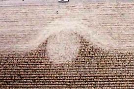 Single 47' circle discovered during harvesting. The lay was described as “generally clockwise” but also in a “somewhat erratic” direction. Although no evidence of prior human entry to the circle was discovered, three 6-inch diameter holes were discovered near the center of the circle spaced about 6 feet apart, and the stalks at the center were “smashed” to the ground. Stalks near the edge of the circle were bent at a 20º angle with the ground.