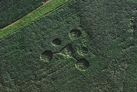 Hoaxed formation found less than 100 ft from 2003 West Union formation. Man-made, mechanical damage (broken stalks) was found throughout the entire formation. The pathways were aligned to ground objects (poles). The central axial holes were found partially filled in. There were no anomalous meter readings.
