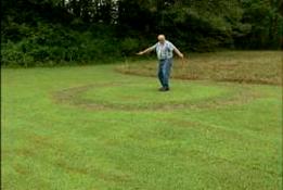 Discovered by man as he was walking in the yard when “his foot punched into the ground”. Originally just light green, the grass in the ring quickly died. As of 2004, the circle still remains. Possible ‘fairy’ / fungus ring?