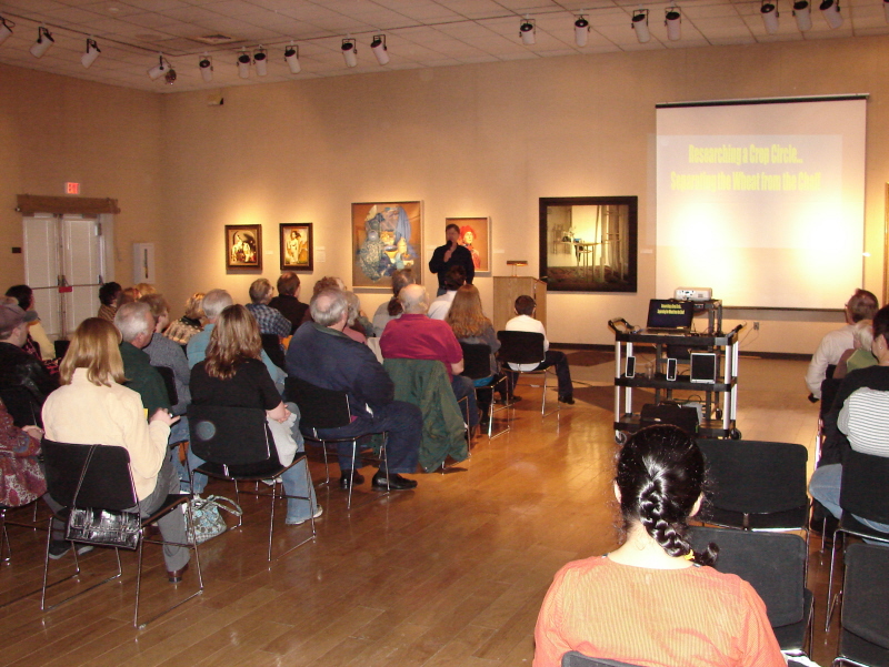 I have one public crop circle presentation planned: Monday, October 12, 2009 at 6:30 P.M. CDT at the Princeton Public Library, Princeton, Indiana. (To learn more go to our Events Page or visit http://www.princetonpl.lib.in.us/OctoberPrograms.pdf)